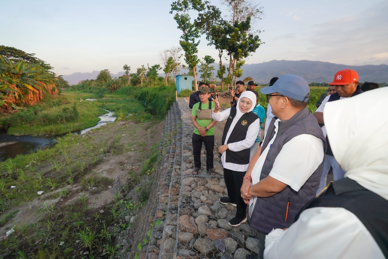 Jatimsatu.net- Gubernur Khofifah Indar Parawansa meninjau pemasangan bronjong di Sungai Selowogo, Desa Mlandingan Kulon, Kecamatan Mlandingan, Kabupaten Situbondo, Sabtu (27/9).