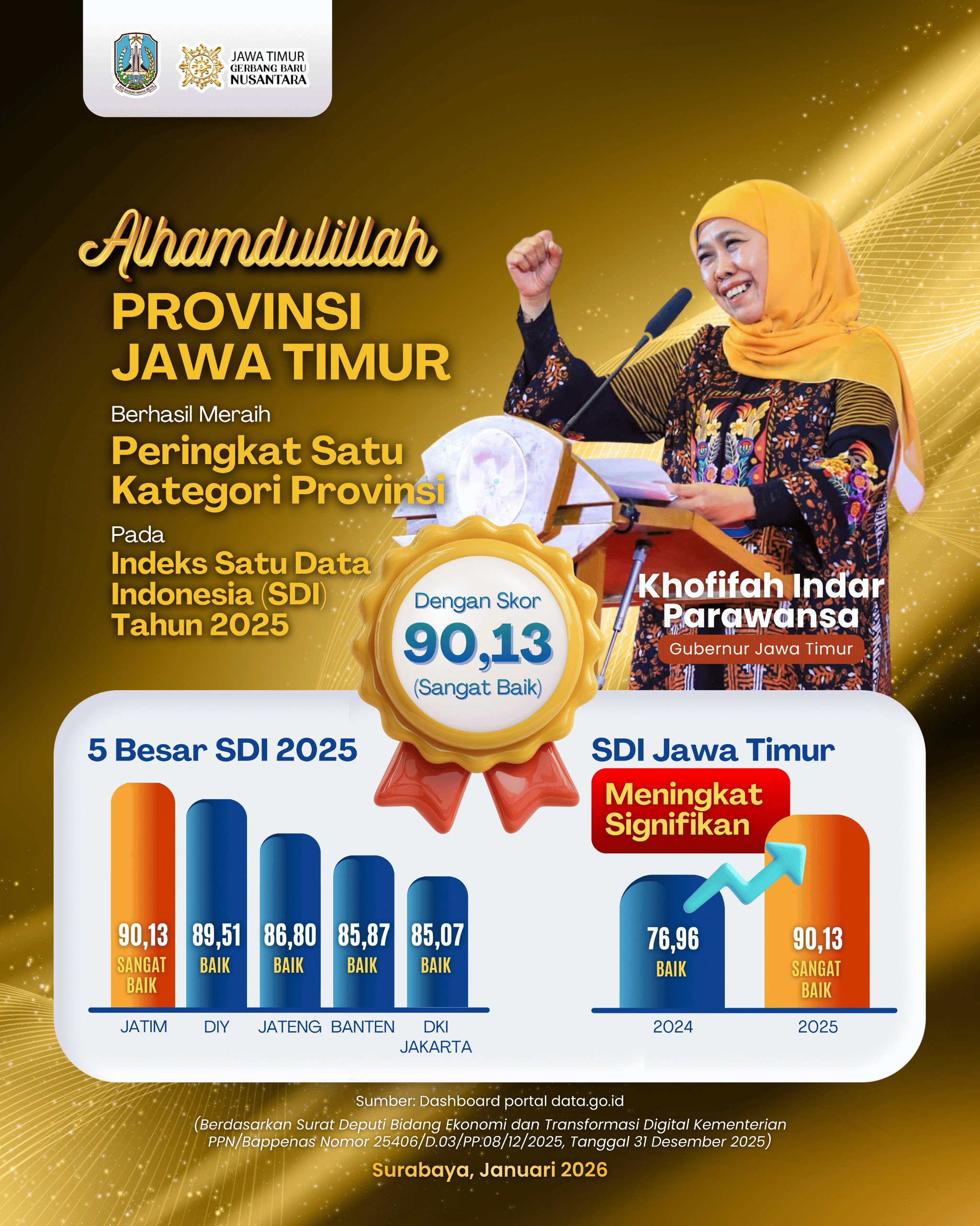 Jatimsatu.net- Pemerintah Provinsi Jawa Timur kembali menorehkan prestasi membanggakan di tingkat nasional. Berdasarkan hasil Evaluasi Penyelenggaraan Satu Data Indonesia (SDI) Tahun 2024 yang ditetapkan sebagai Indeks SDI Tahun 2025, Jawa Timur berhasil mencatatkan lonjakan signifikan nilai Indeks SDI, sekaligus meraih peringkat satu nasional dengan skor 90,13. Berdasarkan surat Deputi Bidang Ekonomi dan Transformasi Digital Kementerian PPN/Bappenas nomor 25406/D.03/PP.08/12/2025 tanggal 31 Desember 2025