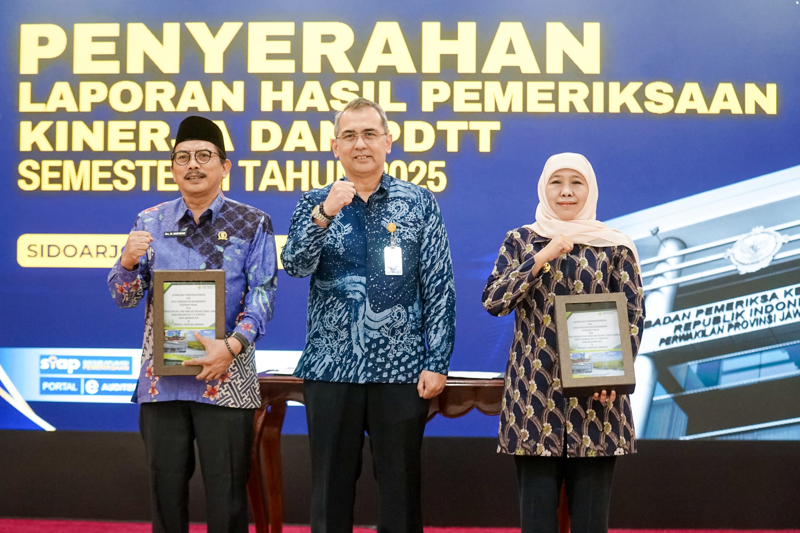 Jatimsatu.net- Gubernur Jawa Timur Khofifah Indar Parawansa menerima Laporan Hasil Pemeriksaan (LHP) Badan Pemeriksa Keuangan (BPK) RI kinerja dan PDTT dari Kepala Perwakilan BPK Jatim Yuan Candra Djaisin di Kantor BPK Perwakilan Jatim, Jalan Raya Juanda Sidoarjo, Selasa (27/1).